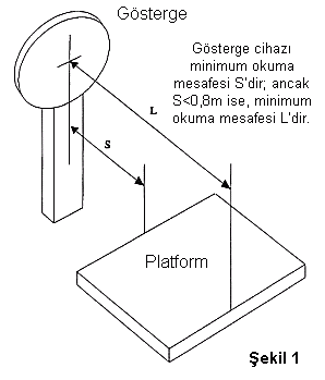 T.4.2 Diskriminasyon Bir aletin küçük yük değişimlerinden etkilenme kabiliyeti. Verilen bir yük için diskriminasyon sınırı, yük alıcısı üzerine gayet yavaşça konulduğunda veya kaldırıldığında gösterimde algılanabilir bir değişikliğe sebep olan en küçük ilave yük değeridir. T.4.3 Tekrarlayabilme Kabul edilebilir sabit test koşullarında aynı yükün çeşitli defalar ve birbirleriyle pratik olarak özdeş şekilde yük alıcısı üzerine konulması halinde aynı sonuçların elde edilmesini sağlayabilen alet kabiliyeti. T.4.4 Dayanıklılık Aletin belirli bir kullanım süresi içinde, performans karakteristiklerini koruyabilme kabiliyeti. T.4.5 Isınma süresi Bir alete (elektriksel) gücün verildiği an ile, aletin gerekliliklere uymaya başladığı an arasında geçen süre. T.5 Gösterimler ve hatalar T.5.1 Gösterim yöntemleri T.5.1.1 Ağırlıklarla dengeleme Yükü dengeleyen metrolojik kontrollü ağırlıkların değeri (yükün redüksiyon oranını da dikkate alarak). T.5.1.2 Analog gösterim Denge pozisyonunun, skala diliminin bir kesrine göre değerlendirilmesini sağlayan gösterim. T.5.1.3 Dijital gösterim Skala işaretlerinin bir dizi hizalanmış rakamlardan oluşmakla, skala dilimi kesirlerine göre enterpolasyon yapılmasına izin vermediği gösterim. T.5.2 Tartı sonuçları Not : Aşağıdaki tanımlar sadece, yük alete konulmadan evvel gösterimin sıfır olması halinde geçerlidir. T.5.2.1 Brüt değer (G veya B) Hiçbir dara veya çalışmakta olan ön ayarlı dara cihazı olmaksızın, bir alet üzerindeki bir yükün ağırlık gösterimi. T.5.2.2 Net değer (N) Bir dara cihazı çalıştırıldıktan sonra, alet üzerine yerleştirilmiş bir yükün ağırlık gösterimi. T.5.2.3 Dara değeri (T) Dara tartma cihazı ile tayin olunmuş, bir yükün ağırlık değeri. T.5.3 Diğer ağırlık değerleri T.5.3.1 Önceden ayarlanmış dara değeri (PT) Alete girilmiş ve belirli bir ağırlığı gösteren sayısal değer. Burada “girme” işlemi; tuşla girme, bir veri hafızasından çağırma veya bir ara birim vasıtasıyla girme gibi işlemleri kapsar. T.5.3.2 Hesaplanmış net değer Brüt veya net ağırlık ile önceden ayarlanmış dara değeri arasındaki fark. T.5.3.3 Hesaplanmış toplam ağırlık değeri Birden fazla ağırlık değerleri ve/veya hesaplanmış net değerlerin hesaplanmış toplamı. T.5.4 Okuma T.5.4.1 Basitçe sıralayarak okuma Tartı sonucunun, hesaplamaya gerek olmadan, ardarda gelen sayıların basitçe sıralanması suretiyle okunması. T.5.4.2 Toplam okuma yanlışlığı Analog gösterimli bir aletin toplam okuma yanlışlığı, normal kullanma koşullarında birkaç gözlemci tarafından okuması yapılan gösterimin standart sapmasına eşittir. Bir sonuçtan en az on kez okuma yapılması alışılmış yöntemdir. T.5.4.3 Yuvarlatılmış dijital gösterim hatası Gösterim ile aletin analog göstergeli olması halinde vereceği sonuç arasındaki fark. T.5.4.4 Minimum okuma mesafesi Bir gözlemcinin, normal kullanma koşullarında, gösterge cihazına değer almak için serbestçe yaklaşabildiği en kısa mesafe. ![]() Gösterge cihazı önünde en az 0,8 m.lik bir açık alan varsa, bu gözlemci yaklaşmasına serbest olarak nitelendirilir (bkz. Şekil 1). T.5.5 Hatalar T.5.5.1 (Gösterim) hatası Bir aletin gösterimi eksi kütlenin (konvansiyonel) doğru değeri. T.5.5.2 Yapısal hata Bir aletin referans koşullar altındaki hatası. T.5.5.3 Başlangıçtaki yapısal hata Aletin performans ve ölçüm açıklığı kararlılığı testlerinden önce belirlenen yapısal hatası. T.5.5.4 İzin verilebilir maksimum hata Alet referans pozisyonunda yüksüz durumda sıfır göstermek kaydıyla, aletin gösterimi ile buna tekabül eden ve referans standart kütleler vasıtasıyla belirlenen doğru değer arasındaki, yönerge esaslarınca izin verilebilir pozitif veya negatif maksimum fark. T.5.5.5 Kusur Bir aletin gösterim hatası ile yapısal hatası arasındaki fark. Not : Prensip olarak kusur, bir elektronik aletin içinde bulunan veya içinden akan veride istenmeyen değişmenin sonucudur. T.5.5.6 Önemli kusur e’den büyük kusur. Not : Bir multi-taksimatlı alet için, e değeri kısmi tartma aralığına uygun düşen değerdir. Aşağıda belirtilen kusurlar, e değerini geçtiği hallerde bile önemli kusur olarak sayılmaz: